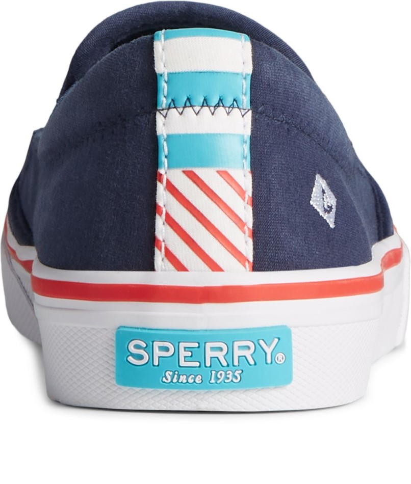 Ein Einfacher, Unkomplizierter Und Modischer Slip-On-Sneaker, Perfekt Für Eine Vielzahl Von Tragegelegenheiten. Obermaterial Aus Weichem Twill In Einem Doppelkeil-Design Für Einfaches An- Und Ausziehen In Einem Soliden Marineblau, Aber Mit Farbenfrohen Fersenkappen Komfort Und Eine Flexible, Nicht Abfärbende Gummiaußensohle Mit Sperry Burgee-Profilmuster